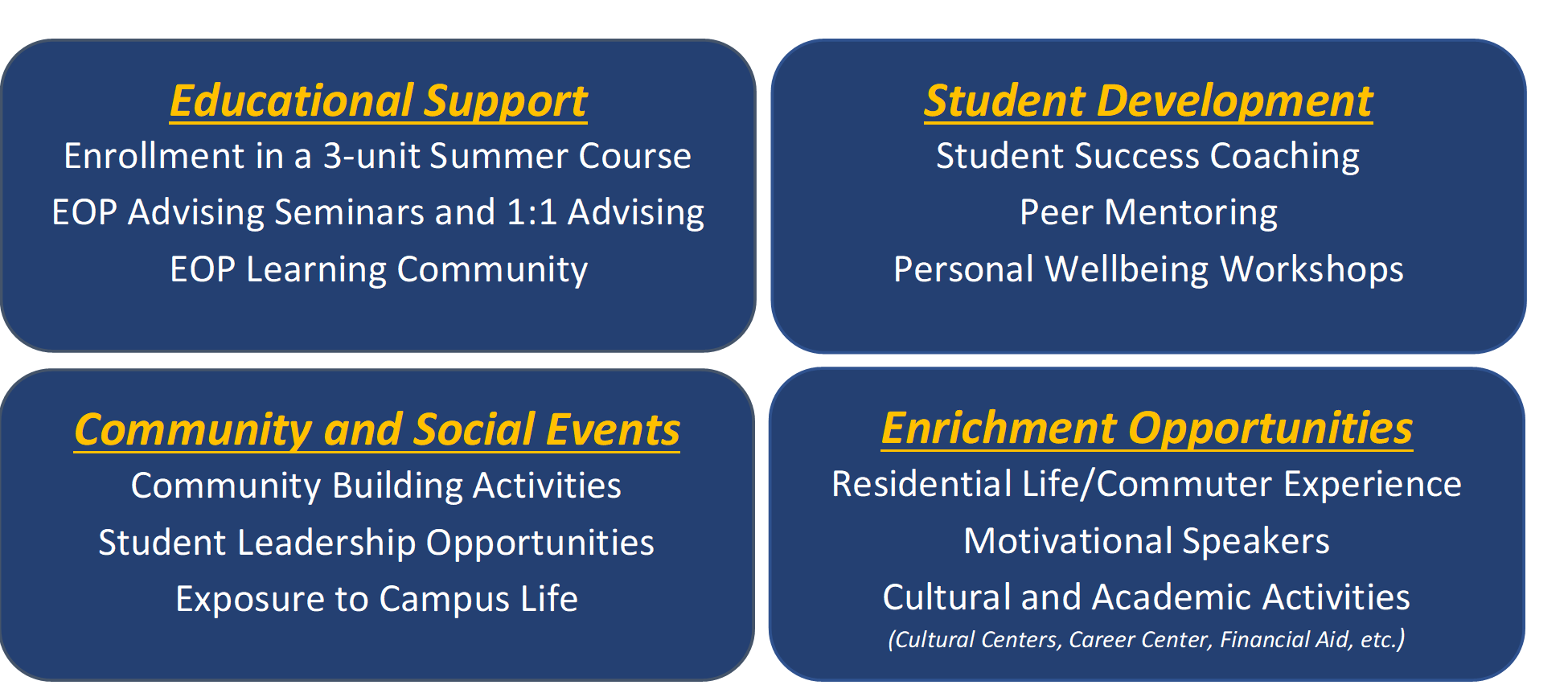 Both in-person and virtually, throughout the five-week program, students are exposed to in-depth topics that equip them with knowledge and a support system to confidently begin their collegiate journey. Participants are also enrolled in a three-unit summer course, Introduction to Ethnic Studies, where they are exposed to fundamental theories of race relations, college level rigor, and opportunities to build intentional faculty mentorships. Additionally, EOP Learning Strategists are embedded in class to create a learning community focused on increasing students’ academic self-efficacy.