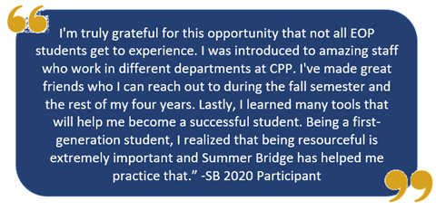 Summer Bridge (SB) is a free comprehensive, five-week summer transition program where incoming first year EOP students are invited to participate to connect, learn, and grow with their EOP community. Participants get a head start in their college journey, build a support system, and gain essential skills that facilitate their transition and success at CPP. In this intensive program participants are exposed to four main core elements: