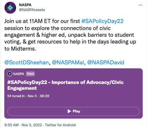 The goal of the inaugural NASPA Public Policy and Advocacy Day was to have Student Affairs professionals to be better informed about topics that are currently impacting our work. The insights shared that day hopefully led to fruitful conversations among the Student Affairs community and provided NASPA members the chance to learn, engage, and vote on November 8th, 2022.
