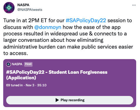 In a recent NYT opinion piece, professor and writer, Don Moynihan commented on the ease of the federal student aid application process, where 22 million people submitted applications in the first week alone. Join a conversation with Dr. Moynihan to discuss how the student loan application serves as a vehicle to understanding challenges of administrative overhead and best practices of policy in practice.