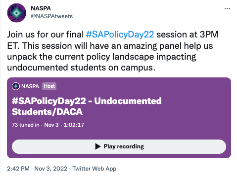 On Thursday November 3rd, 2022 the NASPA held the first Public Policy and Advocacy Day. The intention of this day was to have members of NASPA learn about key topical issues impacting higher education policy today and join the movement to deepen the level of impact for Student Affairs in the change-making process. NASPA Policy and Advocacy Day was developed using the Learn, Engage, Vote, advocacy model. Throughout the day thought leaders and passionate SA professionals shared their thoughts and work that impact the field on a variety of topics. Topics of the day included: civic engagement, mental health on campus, student loan forgiveness, and the impacts for undocumented students and Deferred Action for Childhood Arrivals (DACA) recipients.